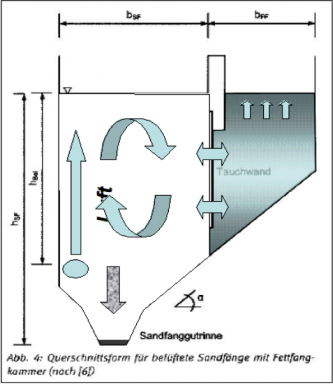 Der Sandfang wird im allgemeinen in der Form eines kombinierten belüfteten Sand- und Fettfangs (Abb. 4) nach dem Regelwerk der DWA (2008) ausgeführt. Im Deutschen Regelwerk nach DIN und auch im Europäischen Regelwerk nach DIN EN sind in den Abschnitten Preliminary Treatment und Grit Removal keine darüber hinausgehenden Angaben zur Abscheidung enthalten.