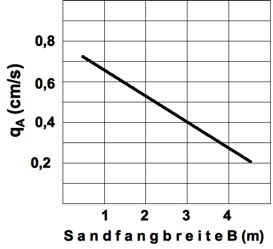 Abb. 9: zulässige Flächenbeschickung qA in einem unbelüfteten Hydrosand- und Fettfang in Abhängigkeit von der Sandfangbreite, für die Normabscheidung 95 % von Sand 0,2 mm und bei einem Längen-Breiten-Verhältnis von 10 : 1.