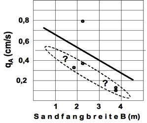 Abb. 10: zulässige Flächenbeschickung qA in Abhängigkeit von der Sandfangbreite und für die Normabscheidung 95 % von Sand 0,2 mm in unbelüftetem Hydrosand- und Fettfang (durchgezogene Linie) und in belüftetem Sand- und Fettfang (gestrichelter Bereich)