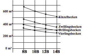 Bei gleicher Flächenbeschickung ergibt sich eine Oberfläche A, die wahlweise in unterschiedlichen Längen- Breiten- Verhältnissen x = L / B verwirklicht werden kann. Im allgemeinen kann ein Richtwertbereich 10 < x < 14 angenommen werden. Das Breiten – Tiefen – Verhältnis y ist im Bereich 0,8 < B/T > 1 als üblich anzusehen. Außerdem ist die Mehrstraßigkeit abzuwägen und grundsätzlich wegen der höheren Abscheidung zu bevorzugen. Dem maschinellen Mehraufwand steht in der Regel eine höhere Betriebsflexibilität zusätzlich zur erhöhten Abscheidung gegenüber. Mit der geometrischen Koppelung ergeben sich mit abnehmender Breite B zwar längere Becken, aber kleinere, teilweise wesentlich kleinere Volumina V, wie in Abb. 8 für ein typisches Beispiel dargestellt.