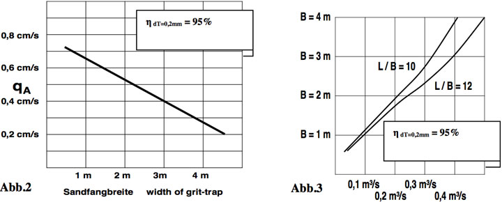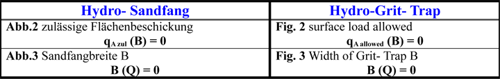 Abb. 2: Zul. Flächenbeschickung qA in Abhängigkeit von der Sandfangbreite B für unbelüfteten Hydro-Sand- und Fettfang.